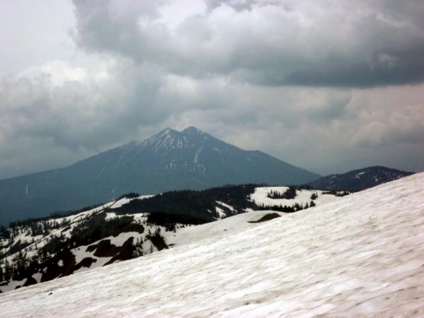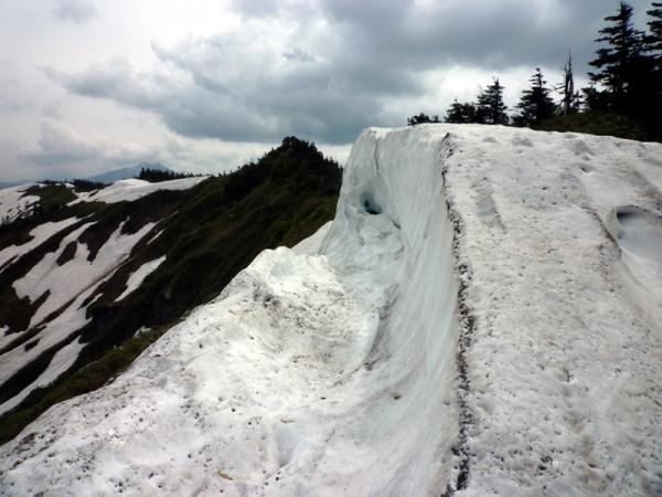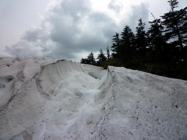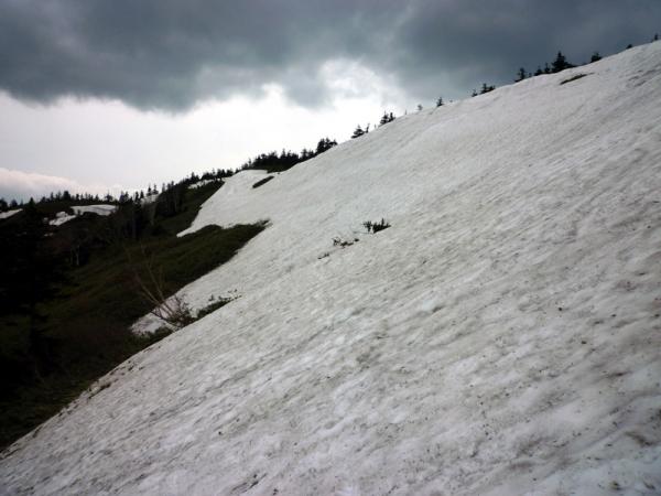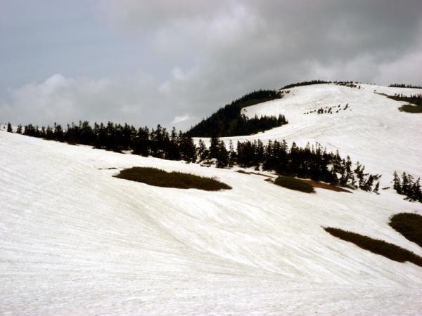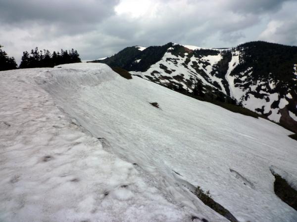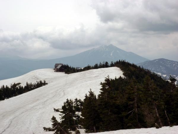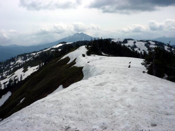 標高1600m辺りから雪が着いています。しかも「ところどころ」というレベルではなく、ほぼ全面付着。要6本爪アイゼン!!正面に駒の小屋が見え、右へ眼を転じるとなだらかでたおやかな美しい山頂が見えます。雪の急登をヒーヒー言いながら小屋へ向けて登ると山頂へ向う稜線へ。小屋に寄ってもよいですが、僕は寄らずトラバース気味に山頂へ向いました。再び急登を登ると山頂。山頂に限り雪はありません♪