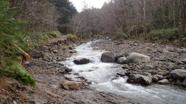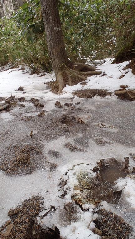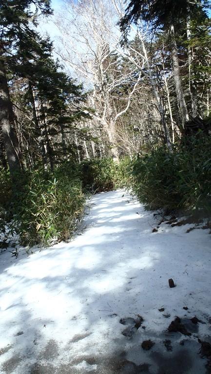- 整備されていますが、ぬかるんでいるとこもかなり多いです。万計沼から上は登山道はほぼ積雪あり。深くてせいぜい足首程度です。雪の下はドロドロの登山道なのでスパッツは必携。軽アイゼンは使いませんでしたが、あったほうが良いです。