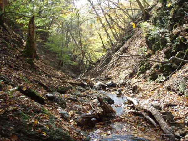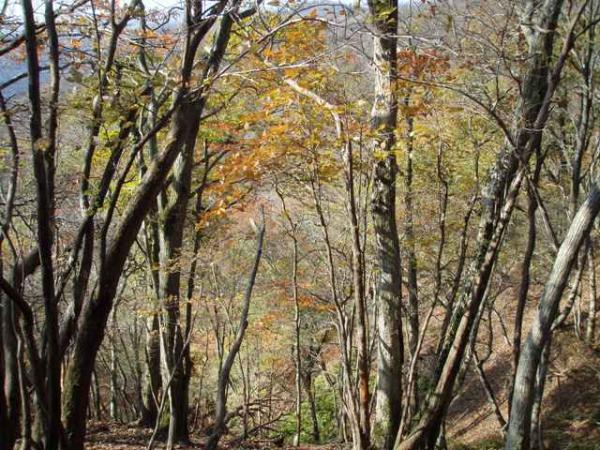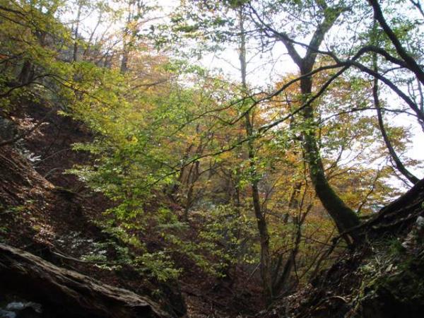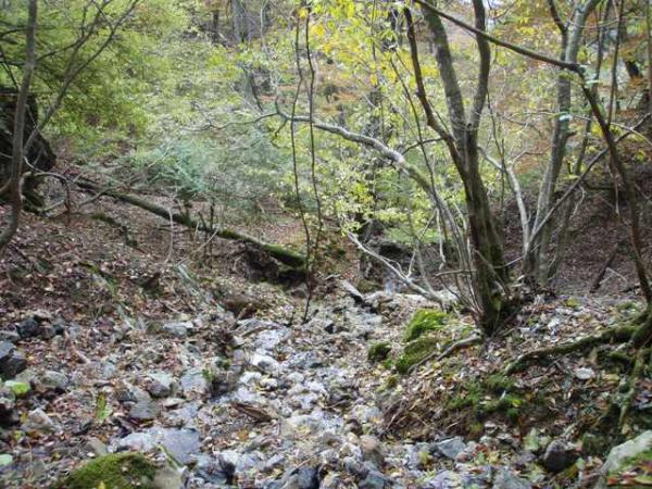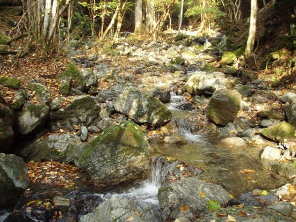 先の分岐に戻り「ヒノコ」方面へ進み、地図の「迷」マークの辺りからGPSを見ながら進路修正しつつ皆子谷に下る。踏み跡は消えており、ときおり紺色の紐があるのが、往年の登山道の名残っぽい。源頭部の景色は綺麗ですが、足場の悪い沢を下るのが結構大変です。寺谷と違って目印は付いていないので、自分で安全そうなルートを考えて下るのみ。ストックで浮石を探りながら下って行くと結構効果的。