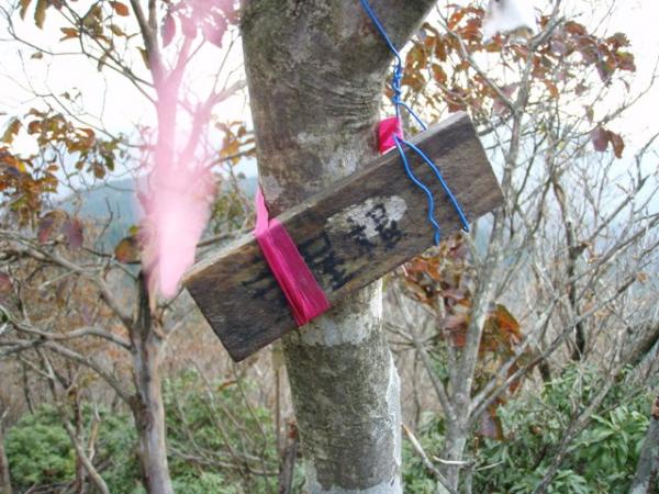 皆子谷は道がほとんどなく沢伝いに歩くため、相当足場が悪いです。紺色の紐と、朽ちた標識が所々に目印で残っています。