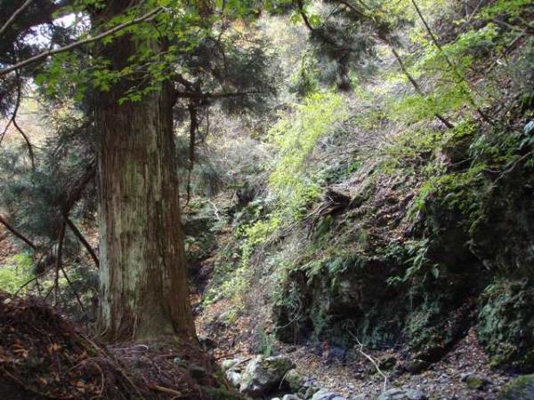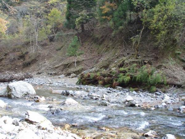 支流がたくさんあるので、登りには使わないほうが良さそうな感じがします。大きな岩のある分岐を過ぎても、道らしき道は無く、大杉を過ぎてかなり下った所でようやく沢を脱出して「道」に合流。標識に従い対岸に渡り、坂を登り下った所で最後の難関である百井川の渡渉地点に到着。