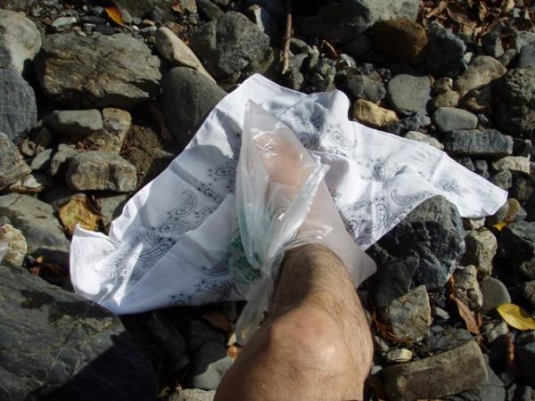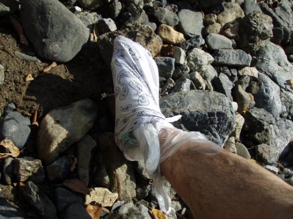 ビニル袋は冷たい水で濡れるのを最小限で抑えるのと、時期によってはヒルの吸着を防ぎます。濡れた布は裸足よりフリクションが良くなるので石で滑るのを防ぎ、足裏の怪我とビニル袋が破れるのを防ぎます。袋とバンダナの間に樹皮などを中敷として入れると、さらに快適になります。通常装備で川や沢を渡る時にオススメの方法です!