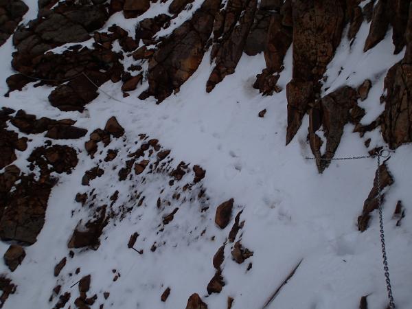 峰の茶屋跡避難小屋から朝日岳までに向かう途中のルートは通常の巻き道のルートでは滑落したら、かなり危険である。急峻なルートではあるが、剣ヶ峰からのルートが一番望ましい。実際に雪があるときはこちらからのルートを取るべきである。