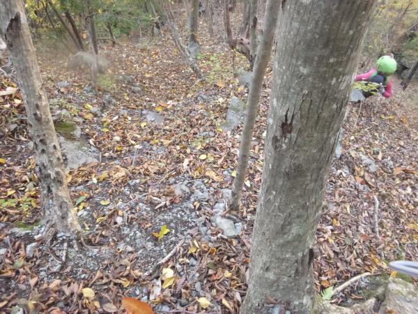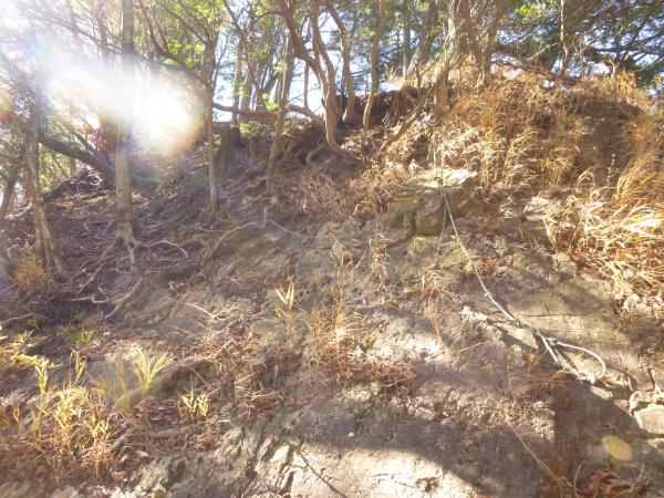 2、取付点からしばらく続く急坂は岩、木、根っこなどつかめるものは全て使って登っていきますが、岩がもろいのでできたらしっかりとした木をつかむ