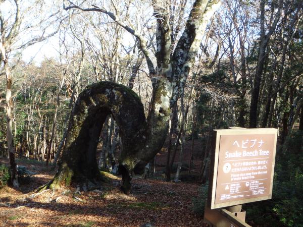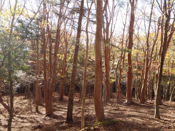 存在感のあるブナの巨木、赤い迷彩柄の艶めかしいヒメシャラの木、