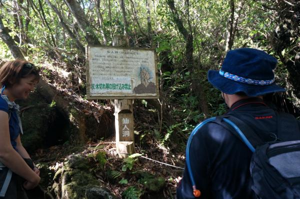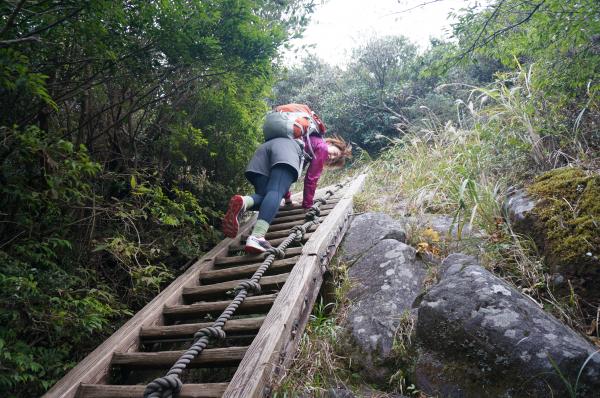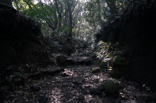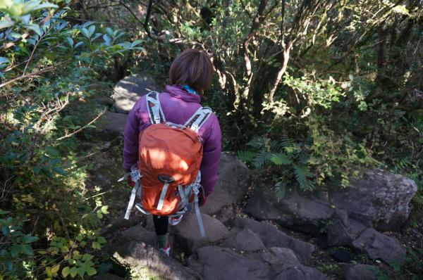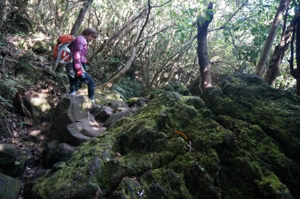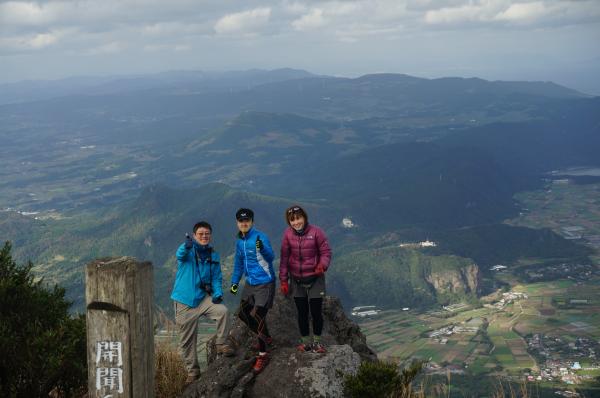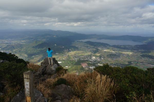 - (毎度おなじみの)登山口の『かいもん山麓ふれあい公園』は駐車場、トイレ、売店などが完備されたレクリエーション施設。キャンプ場やゴーカート場もあります。今回は売店前の道標を右へ向かい、芝生の公園、舗装された林道を数分歩き、本当の登山口二合目へ行きました。ここから延々と鬱蒼とした樹林帯が続きます。11月とはいえ苔むした道は屋久島のよう。小さい溶岩だらけの道ですが危険箇所はほとんどなく眺望が無いことを除けば快適にのんびり歩けます。五合目の展望台があり、東側の薩摩半島、長崎鼻方面の眺望がひらけますが、ここで関東から来たゲストは第一歓声ポイント\(^o^)/!!七合目からときどき南から南西方面(東シナ海方面)が覗けますが、ここが第二歓声ポイント\(^o^)/!!九合目あたりからようやく眺望がひらけ、西から北西方面が。ここで第三歓声ポイント\(^o^)/!!ロープが取り付けられた急階段を登ると山頂はもうすぐ。山頂が第四歓声ポイント\(^o^)/!!