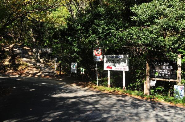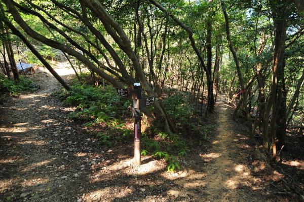 山腹に林道が通っているため、時々舗装路に出ます。こんなに長いルートを選ばなくても、頂上に行きたければ林道を使って、20分ぐらいで行けるところもあります。