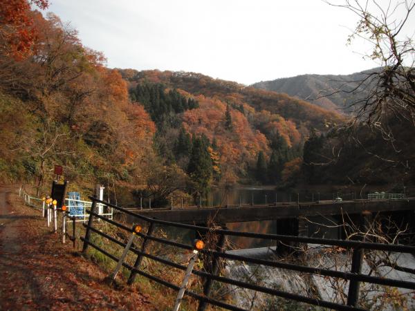 駐車場からダム湖の紅葉を愛でつつ出立。迷った末にワカンも持って行く事に。