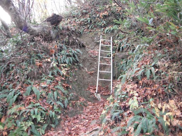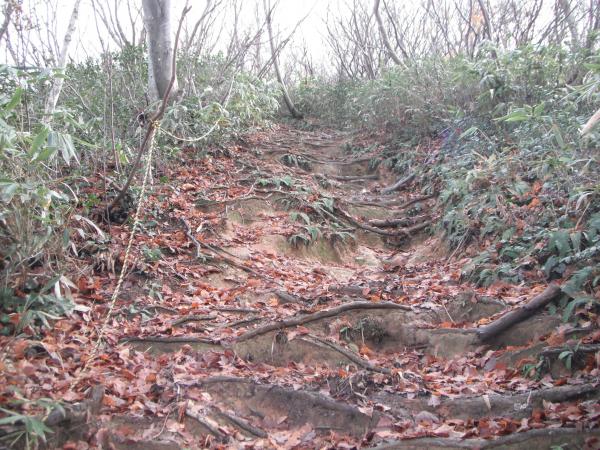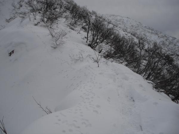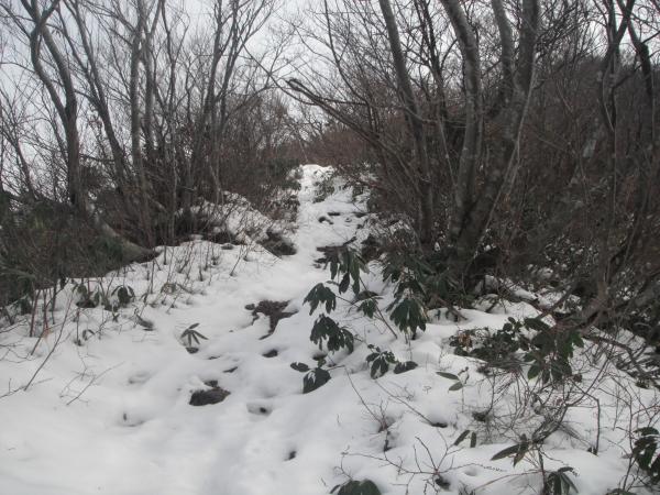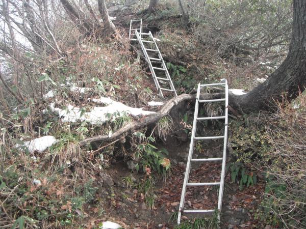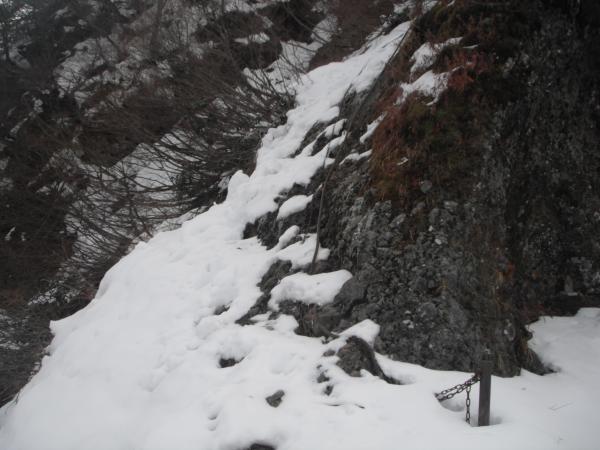 しかし緩急はあるものの滑りやすい急登が続き、ハシゴもちらほら。片側が切れ落ちたクサリ場に緊張し、おまけに予想外に深い雪まで現れる始末。ワカン持って来て良かった!
