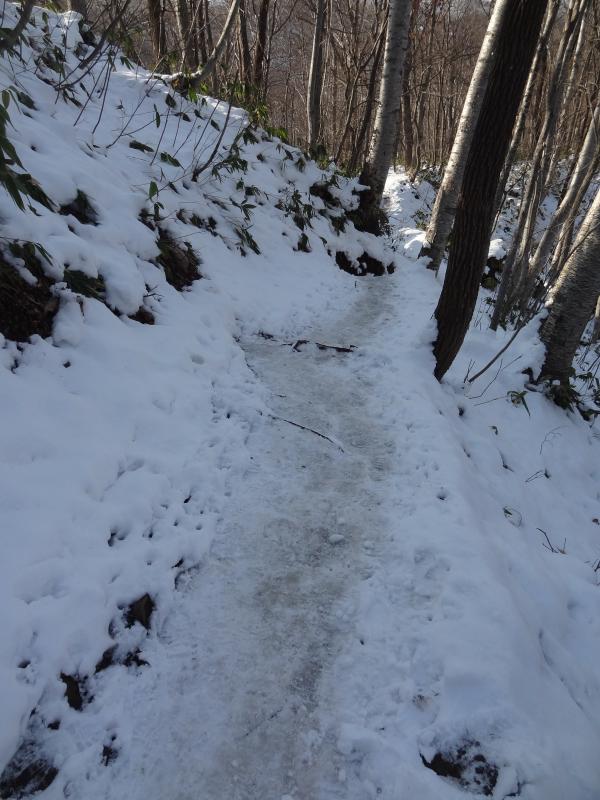 - 全体を通して雪が積もっています。登山道はアイスバーン状態でとても滑りやすくなっています。軽アイゼンが必須です。