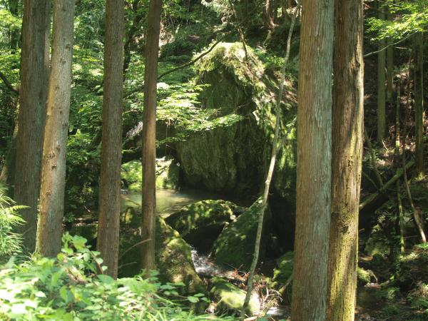 大きな岩や、コケの中をしたたり落ちる水雫を楽しめる道です。