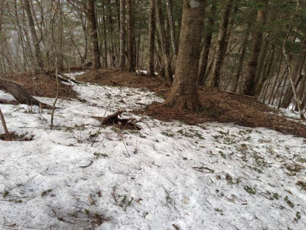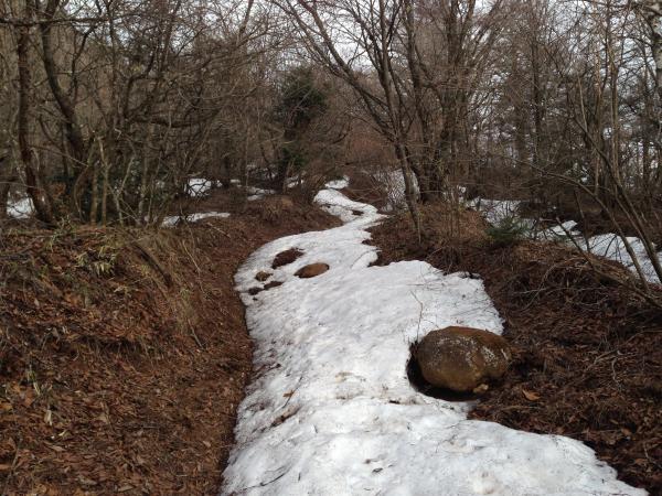 - やや日が当たりにくい斜面のため、遅くまで雪が残っています。朝方はアイゼンやスパイクがあった方が安心です。