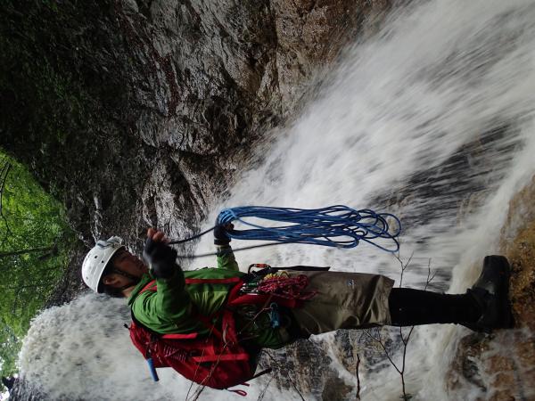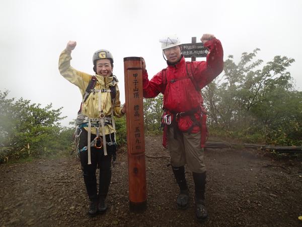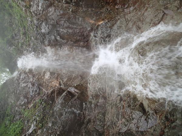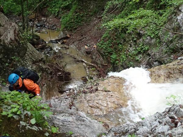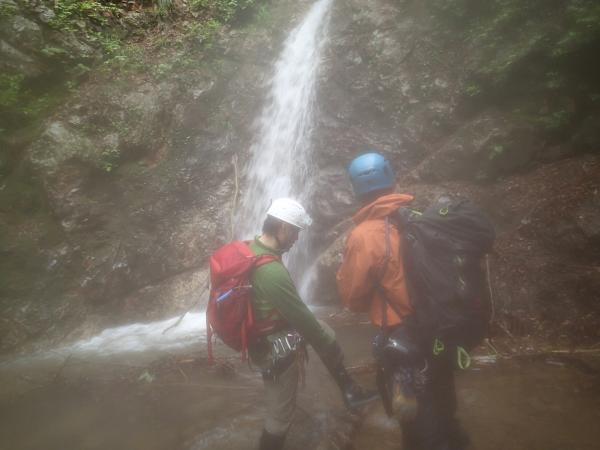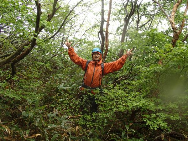 最後の30Mの滝は圧巻。リーダーが苦労して取り付きロープを出してくれ何とか登ることができました。このあたりから雨が降り始め寒かったですが、稜線への藪漕ぎも適度な短さで山頂に到着。速足で下ります。