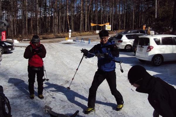 赤岳山荘まではみんなで車で、そのあとは徒歩で歩き始めます。赤岳山荘の駐車場は完全につるつるのため、滑らないよう要注意です。