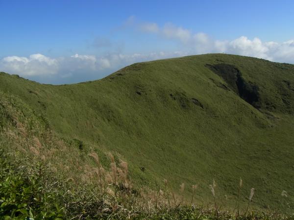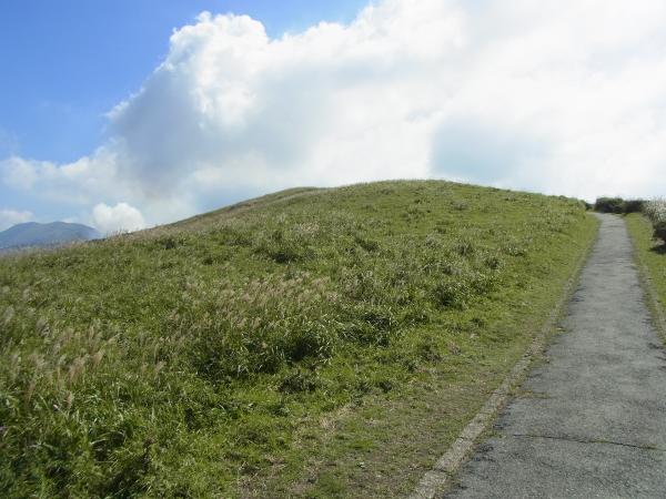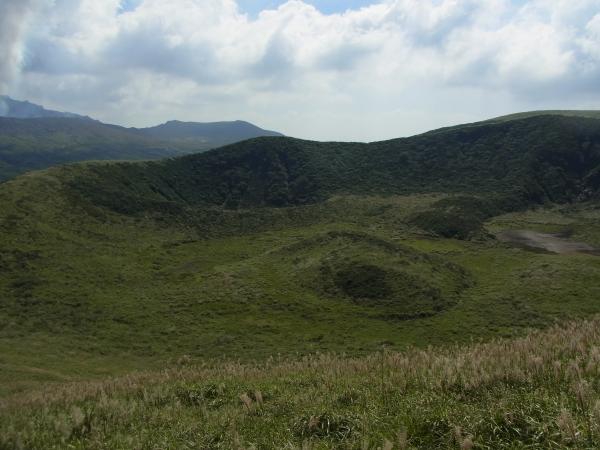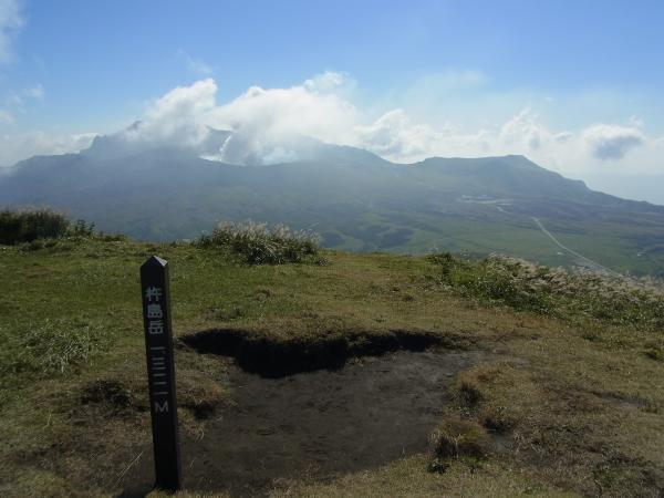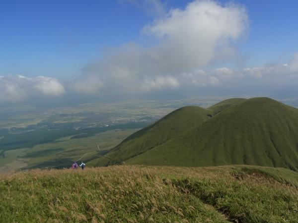 左手に火口、右手を見ると米塚が見えます。鞍部までいったん下って、登り返すと往生岳山頂!
