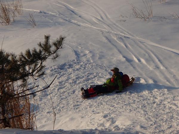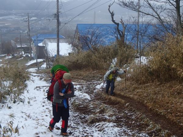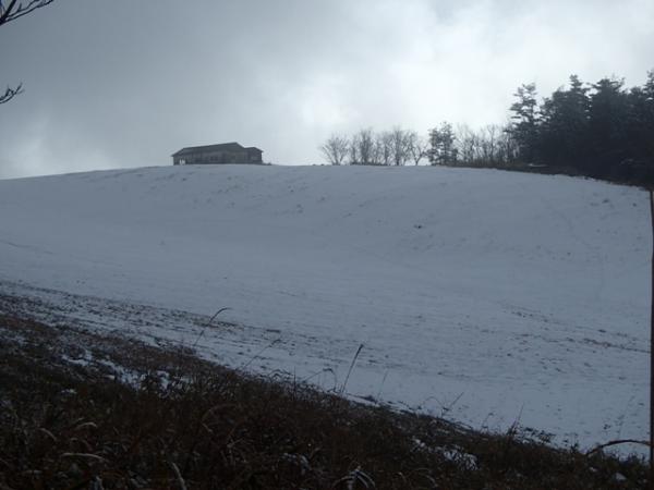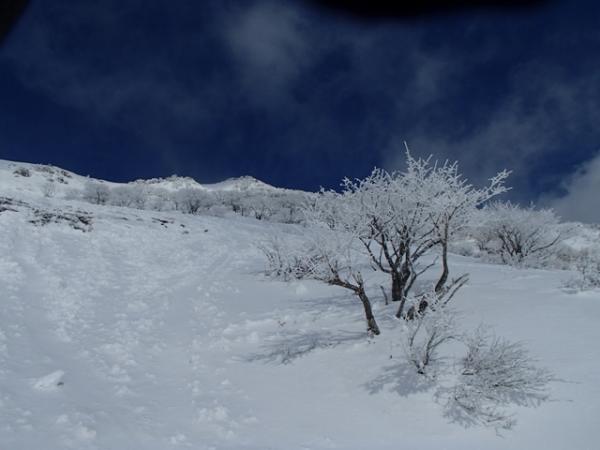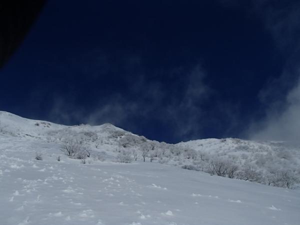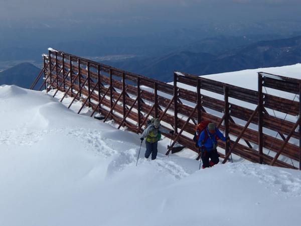非難小屋からの斜度はきつく、この時期の伊吹山ならピッケル、アイゼンが必要です。