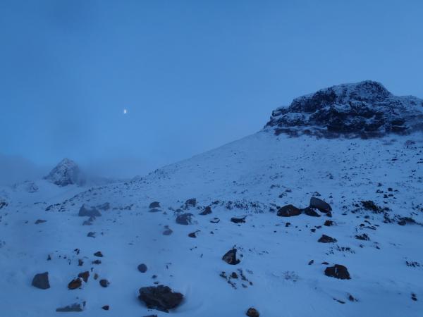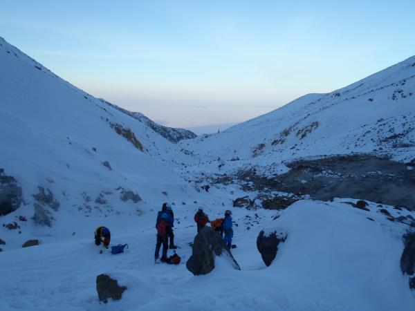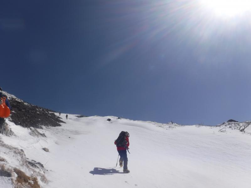 初日は天候に恵まれ快適なクライミングができました。しかし雪の付きが少なく