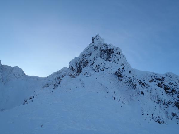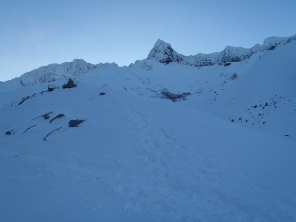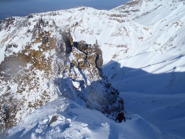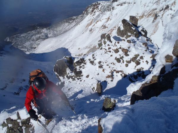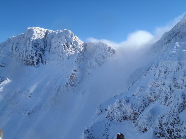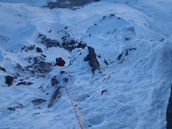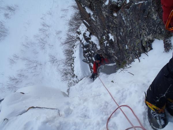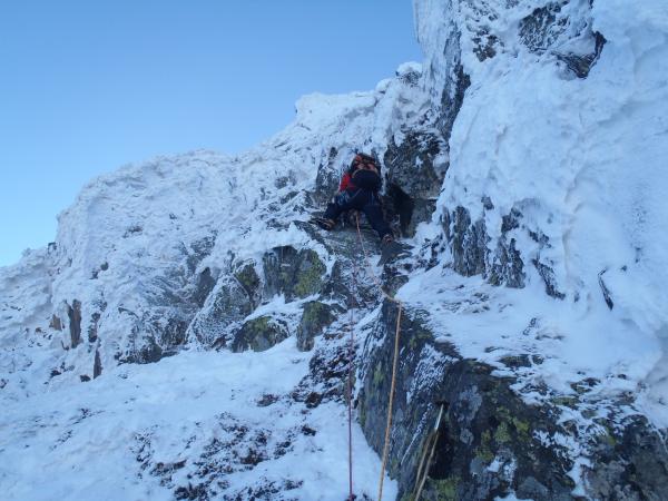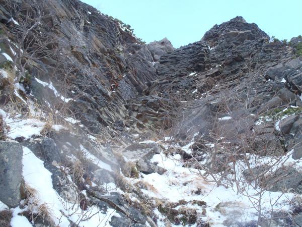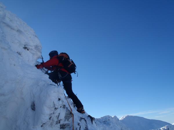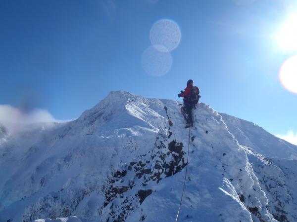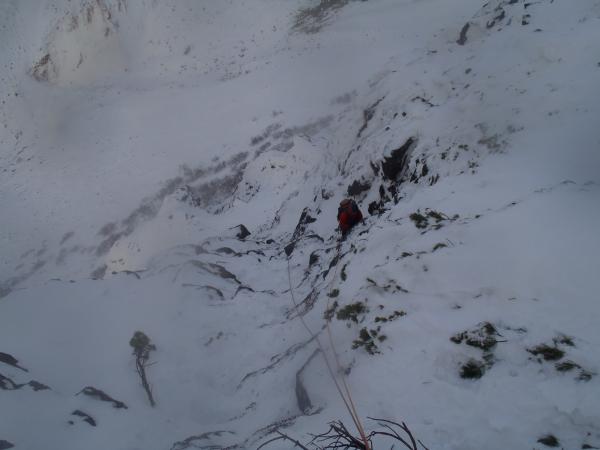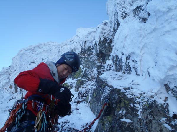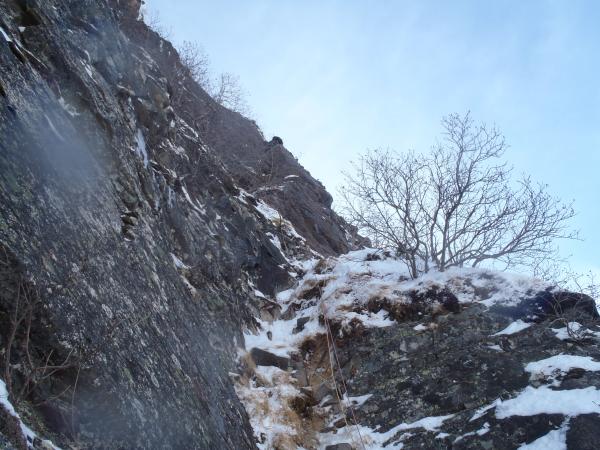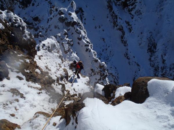 雪が少なく、岩の露出部分がかなり多く、アックスがききにくいところもある。岩登りに近い箇所もあり。2P目の一歩が核心。3P目は稜上とトラバースが選べるが稜上を行きました。一度ラッペルをしてD尾根へ合流。