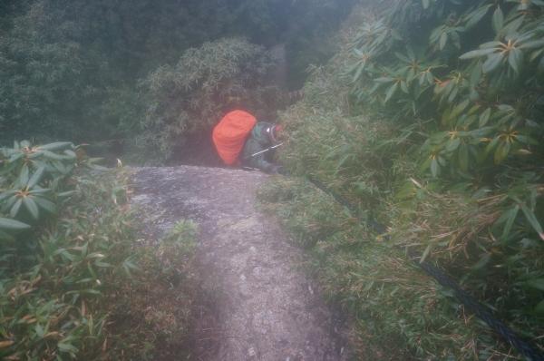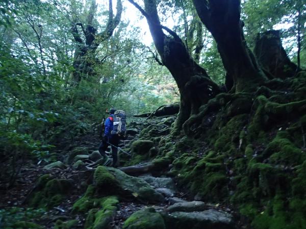 楠川分れからはトロッコ道を歩きます。大株歩道入口から急登へ。しかし、整備された歩きやすい道が続きます。高塚小屋、新高塚小屋を過ぎると稜線は間近、そしてシャクナゲの森へ。焼野三叉路から永田岳~鹿之沢小屋は深いヤブが続出します(*_*)!