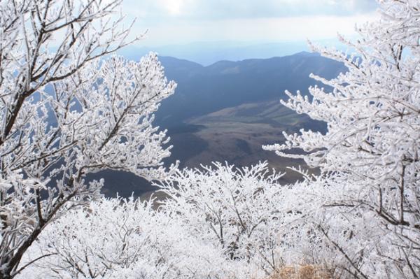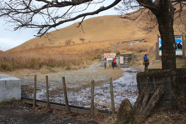 登山口からは、白くなった由布岳や隣の鶴見岳が見えて、ワクワクしながらスタートです。