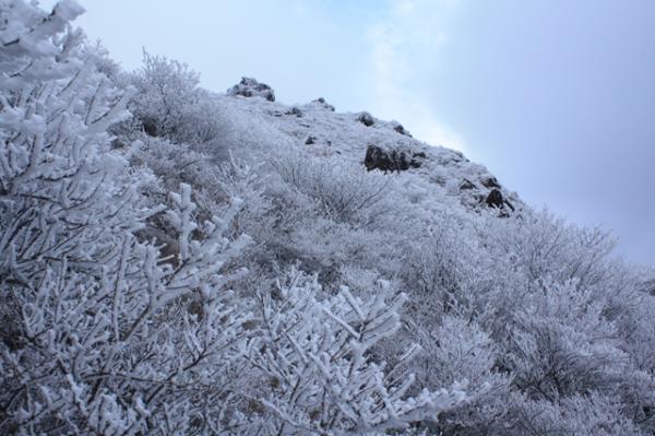 どんどん上っていくとふかふかの雪が楽しめました。そして、霧氷もしっかり付いており、白銀の世界を楽しめました。予想より太陽は顔を出してくれず、たまに青空がでるととてもきれいでした。