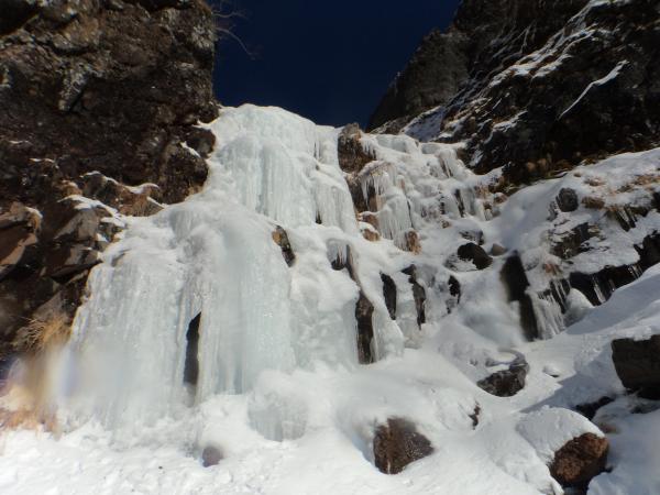 裏同心ルンゼはもう凍っており、それぞれの滝をロープを出したり出さなかったりで登っていきます。次から次に現れる滝に感動しながら上がっていくと、目の前に大同心!登ってみたいです。