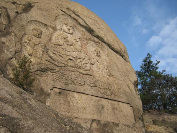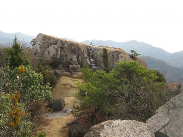 黒滝山の中腹に車を止めて(4台可)登り始めます。いきなり海が見えて朝日に輝いています。黒滝山の山頂は絶景で大久野島や大三島などが見渡せます。すぐ隣りの石鎚はちゃんと鎖があり 祠には小さな3体の蔵王権現がありました。白滝山の磨崖仏は立派で写真以外にもいろいろありました。岩稜が好きな人には物足りないでしょうが散歩がてら歩きたい山です。
