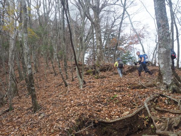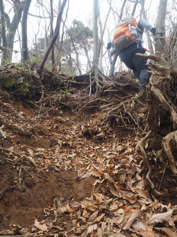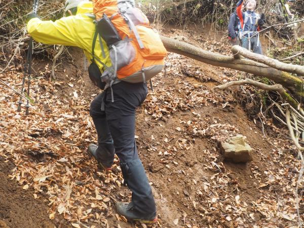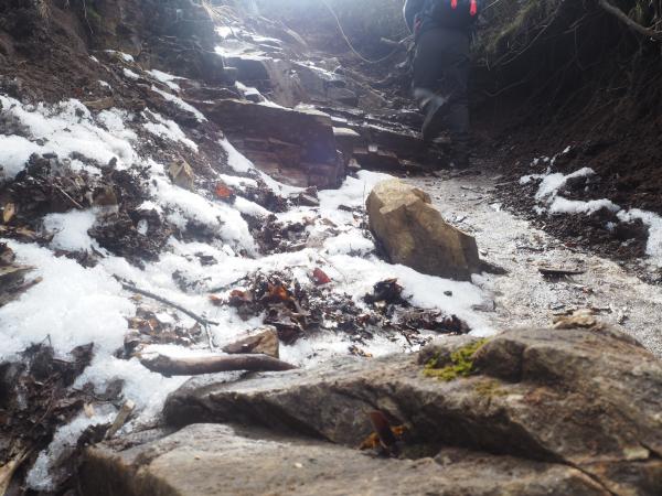 落葉で足場が悪いところ、登山道が崩れているところ、雪が解けてぐずぐずのところがあるので慎重に。