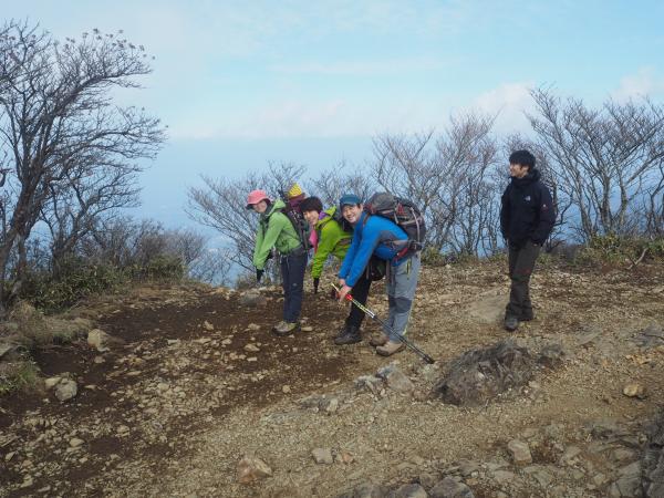 さて、ここから急登です。国見峠までひたすら登ります。登山道が崩れているようなところもあるので要注意。風も吹きつけるようになってきたので途中で上着をプラス。まだ登る~?と思った頃国見峠に到着!天気が良ければ山頂が見えそうですが生憎雲の中。ここはいろんなルートからの合流地点。ここも広いので日向ぼっこしながら山頂を愛でつつのんびり休憩するのもいいかもしれません。が、今日は先を目指します。ちらほら雪も見えるようになってきました。所々凍っていたり、逆に溶けてぐずぐずになっていたり。ちょっと歩きにくいので慎重に。