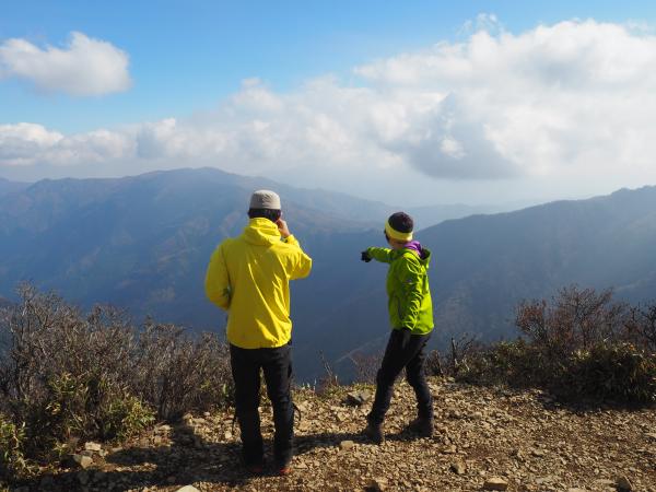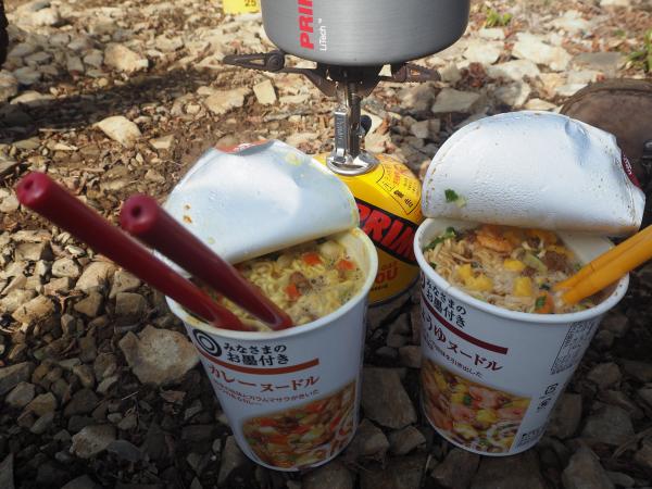 さんちょうからは360度の展望。遠く傾山への縦走路も見渡せます。みんなで記念撮影をしてお待ちかねのランチタイム。なぜかカップラーメン率が高い(笑)