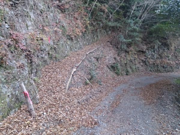 まず林道ゲートは左と右に分けれますが、右です。そして、15分ほど歩くと、ピンクのテープがあり、「これが登山口!?」と思うほどわかりにくい入口があります。
