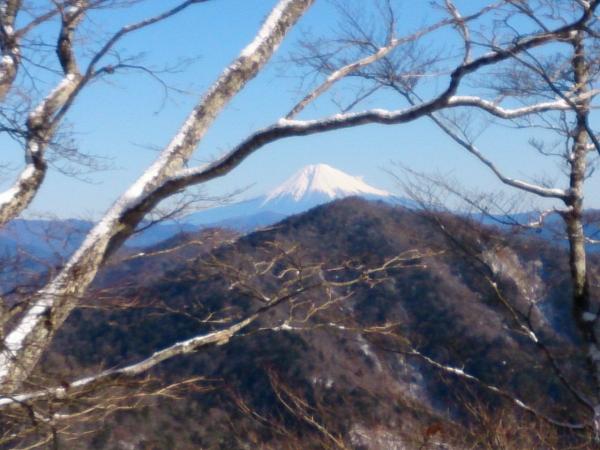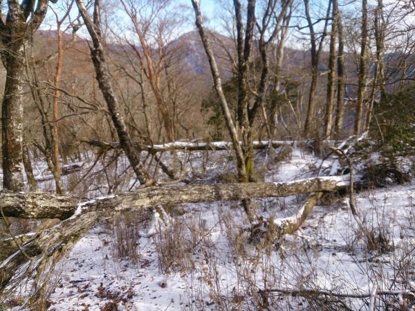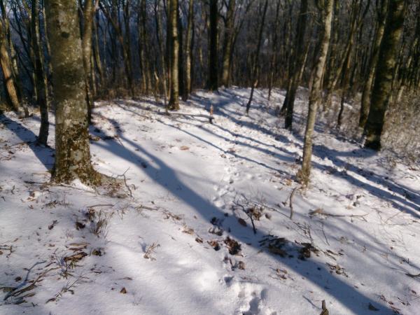すぐに林道にぶつかりますが、ここを左です。林道の途中、見晴しの良い場所から、高塚山や岩岳山への稜線がよくわかります。この辺りから雪or霜が出てきます。哺乳類の足跡が色々ある中、まだ新しいデカい足跡が・・・やっぱりまだ動いてるんでしょう。