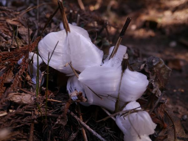 杉林の道を登るとやがてツツジ群生地への分岐に出ます。少し歩くとシモバシラの群落が現れました!
