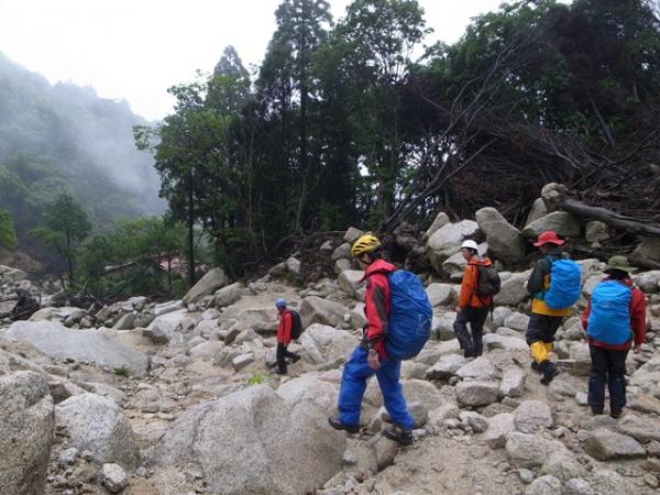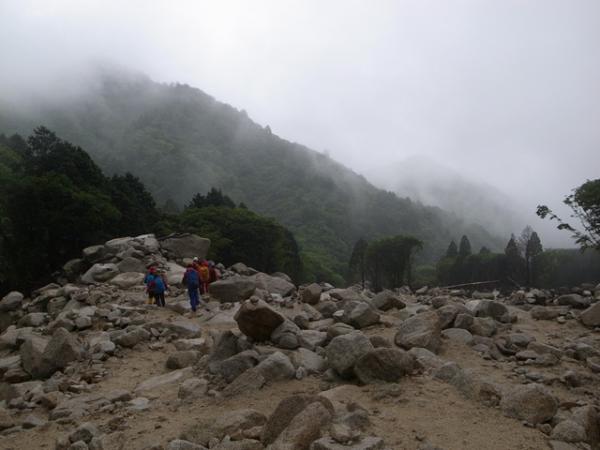 水害の前、登山口にあった見上げる高さの堰堤がなぜあるのか、藤内小屋に至る趣のある清流を見るたびに疑問に感じた時もありました。あの水害ですり切り一杯まで土石に埋まって足元にある堰堤と静かに雨に濡れる湯ノ山温泉が愛おしくも感じました。