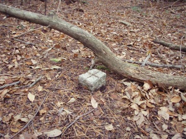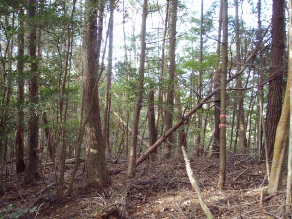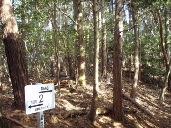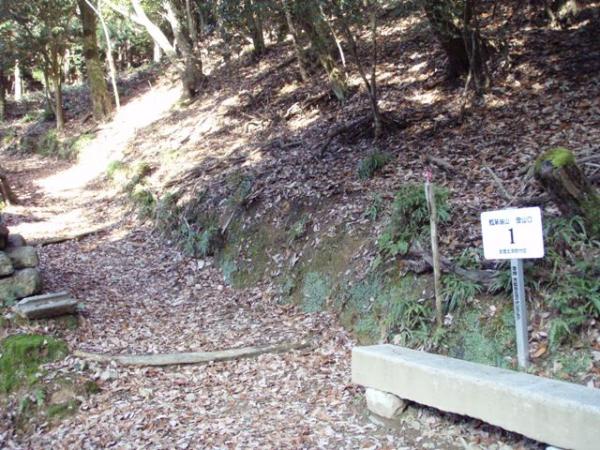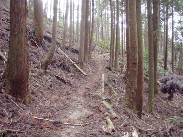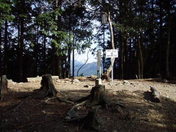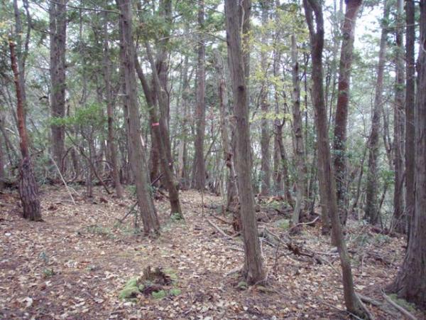 西明寺山の手前で「10/1から11/15まで入山禁止」の標識あり。道なりに下って行くと、西明寺山のピークらしき分岐点に到着。上部に十字を刻んだ四角い石がありましたが、正式な三角点かどうか不明です。標識なし、展望なし。標高235mぐらい。