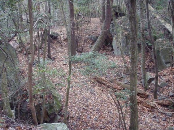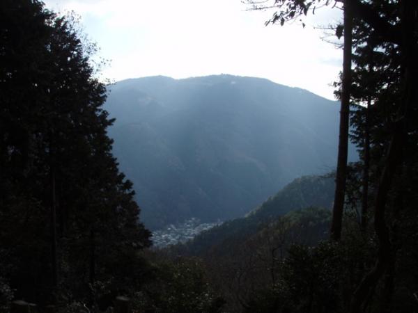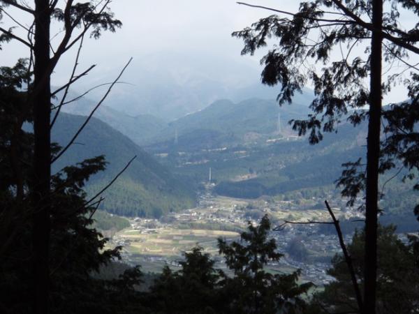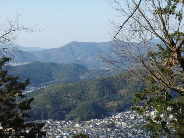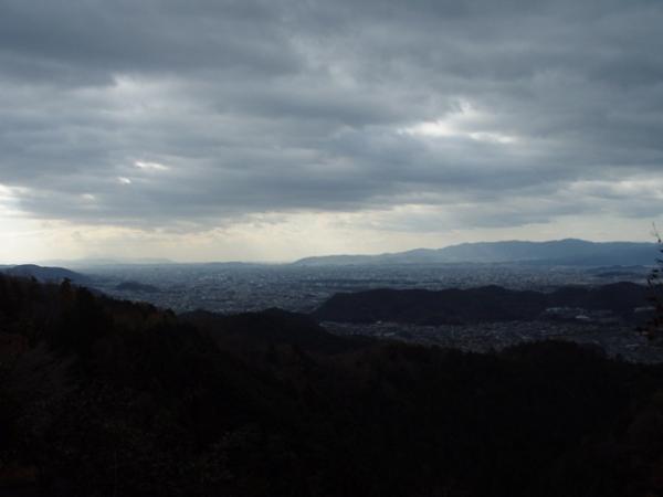 八塩山からの登山道との分岐を過ぎ尾根道を歩いていくと、足元の水溜りが凍っていました。481m地点付近の分岐は「三宅八幡」の標識に従って直進。巨岩が集まる窪地を通り過ぎしばらく行くと、京都市内と西山連峰が展望できる樹木の途絶えた所があります。天気が良ければ絶好の休憩地点ですが、気温が0度に下がったので足早に出発。