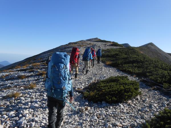 見事な秋晴れの中、ゴールドウィンの社員の皆様と、ガイドさん2名、ゲストの小雀さん、研修の参加者と思い出深い登山となりました。