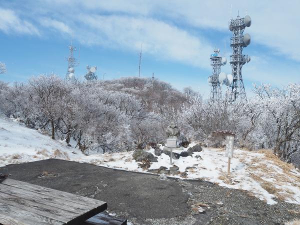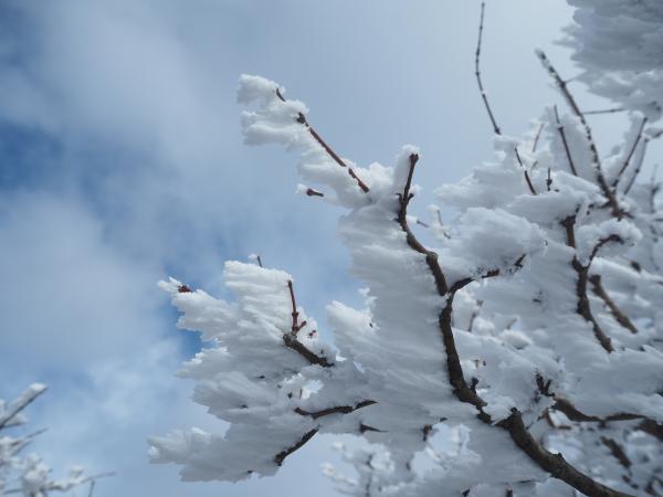 その看板のR地点あたりから雪が見え始めました。さらに登ると立派な雪道に。でも今日はアイゼンは不要のようです。頂上広場に出ると一気に視界が開けます。すごいすごーい、目の前には別府湾、反対側には由布岳が。そして木々には霧氷が。立派なエビのしっぽがありました。山頂には遊歩道が整備されていて七福神めぐりなんかもできたりします。ロープーウェイでここまて一気に上がってこられるので観光にはもってこいですね。ほんの数分でこんな景色が堪能できるんです。ベンチもあちこちに用意されているので由布岳がバッチリ見えるベストポジションでランチタイム。でも寒かった。陽が射している時はいいのですが陰ってしまうととても寒くダウンまで着こみましたが足がスースー。ベストポジションでの我慢のランチでした(笑)