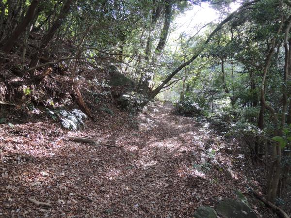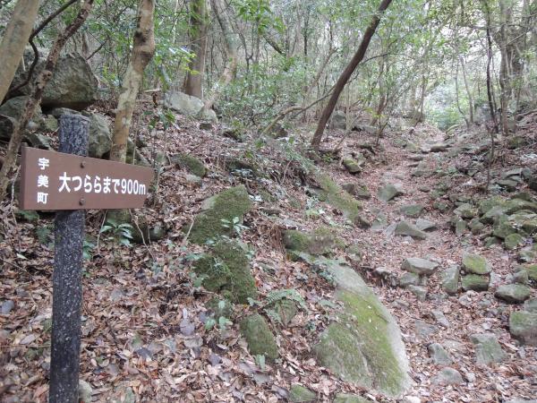 - 林道から登山道のなだらかな傾斜を歩き、途中から岩のゴロゴロした登山道。