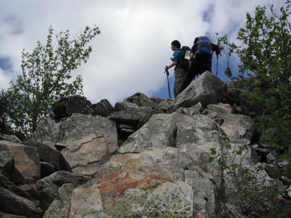 猛暑日で気温は38.5度。ひたすら汗が流れるままスタートです。虫が多く近寄ってくるので、網付きの帽子をかぶっている方がいました。朝日峠から朝日岳の間にあるガレ場からの景色がとても良いです。
