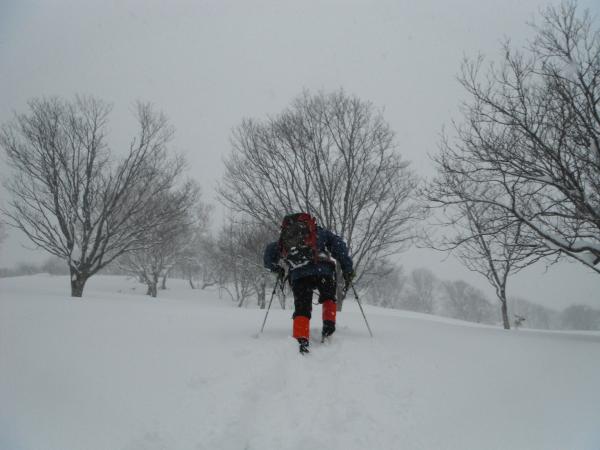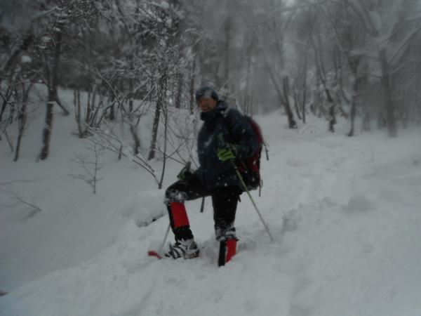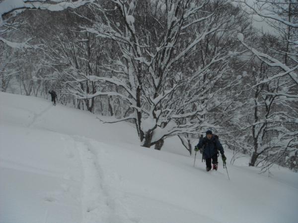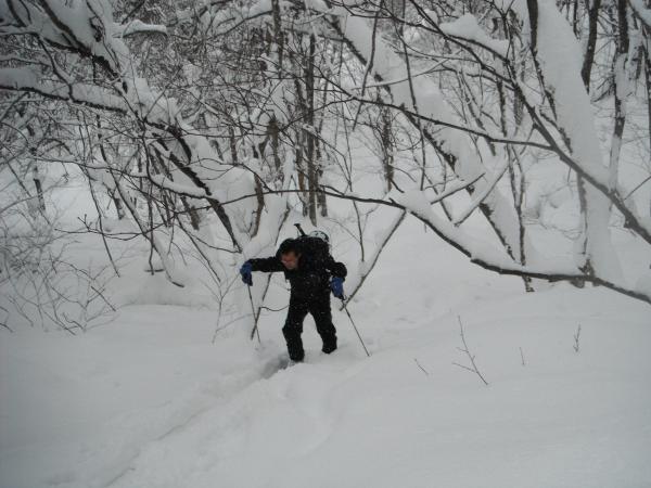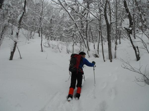 我々より先に入山された人はいなく終始ラッセルでしたが、圧密が進んだ旧雪の上に昨日からの30cm弱の降雪が載り、程良い板の沈み具合で歩きやすかったです。
