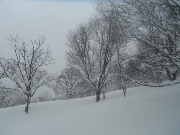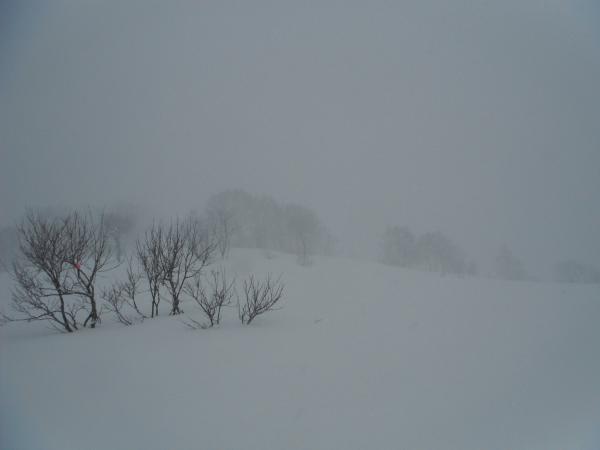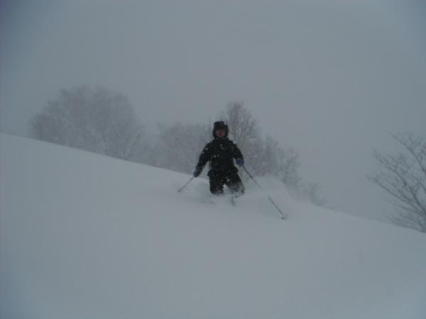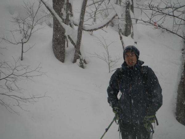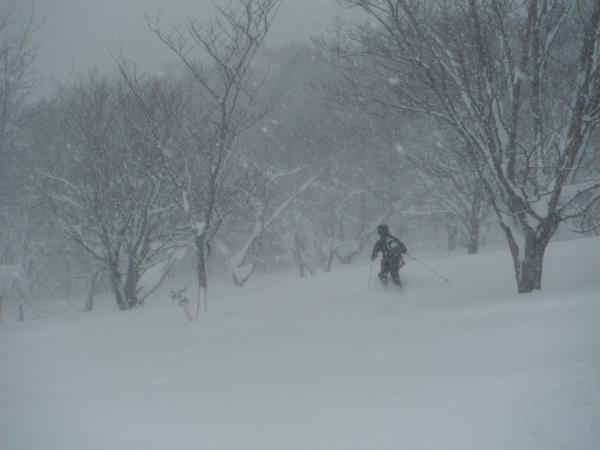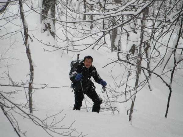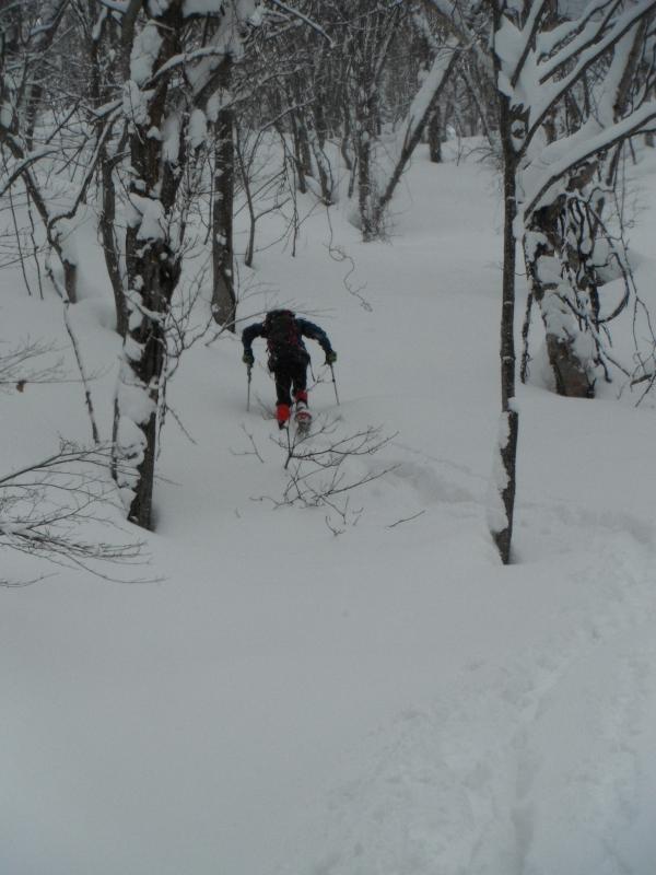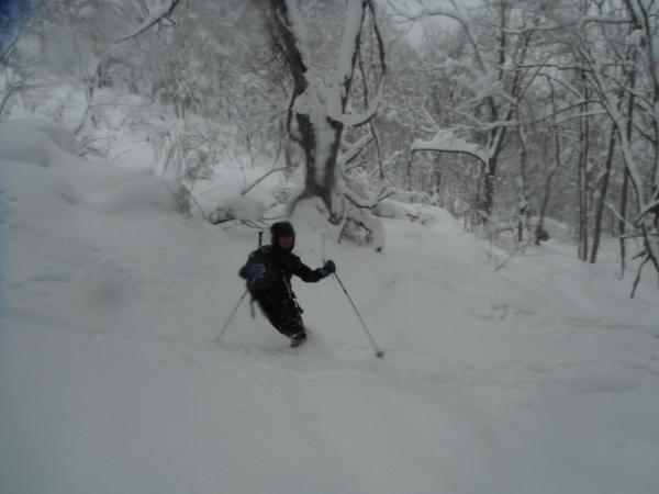 頂上直下から沢筋に入り込むまでは緩い斜面に重いパウダーだったので直滑降気味に滑りました。