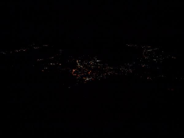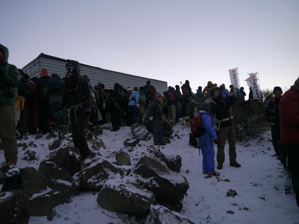 山頂の茶屋の明かりが見えるとすぐに山頂です、5時30分到着。山頂はさすがに寒い~風強い~!
