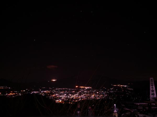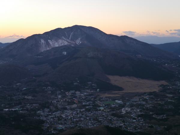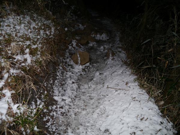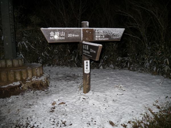 大汗をかかない程度のペースで登ります。金時宿り岩を過ぎると仙石原の夜景が広がり、雪がうっすらと積もる道を進むと明神ガ岳分岐です。