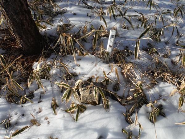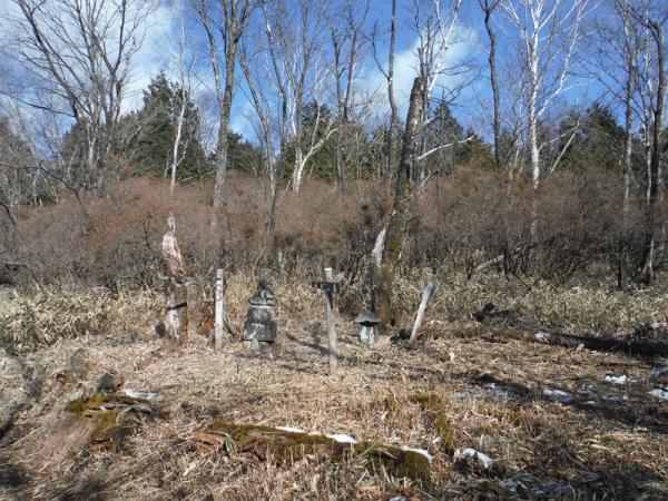 役の小角の祀られた行者堂を過ぎ、殺生禁断石を抜け刈払いのされた道を行くと稚児ヶ墓が見えてきます。この辺りまで雪はなし。歩いていると暑いくらいでした。