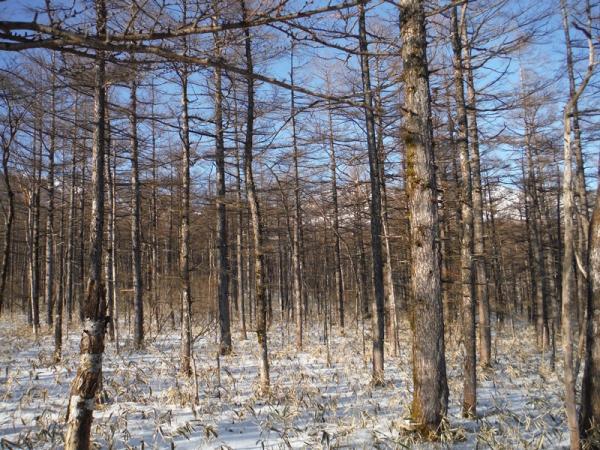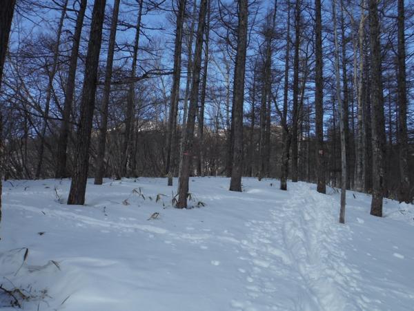 水場を過ぎカラマツの森に入ると雪の上を歩くようになりました。トレースはバッチリ。30-40cmの積雪量です。