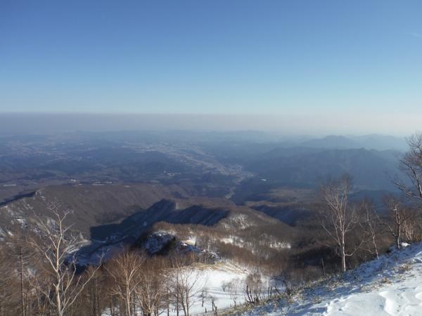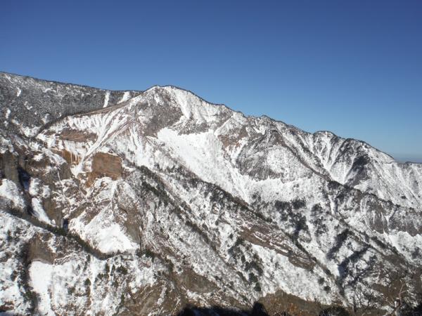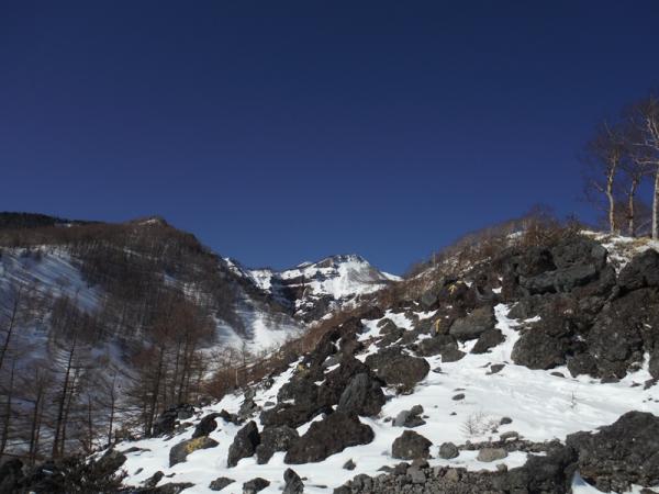 ガレてくると八風という場所に到着。そこからは日光市街が見下ろせ、女峰が前女峰の後ろに姿を見せてくれます。雪とガレの中を少し行くと黒岩の分岐に。まっすぐ行くとピーク。左に行くと巻き。