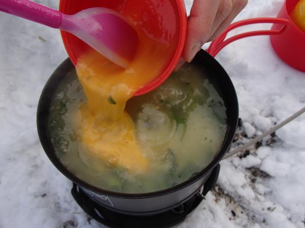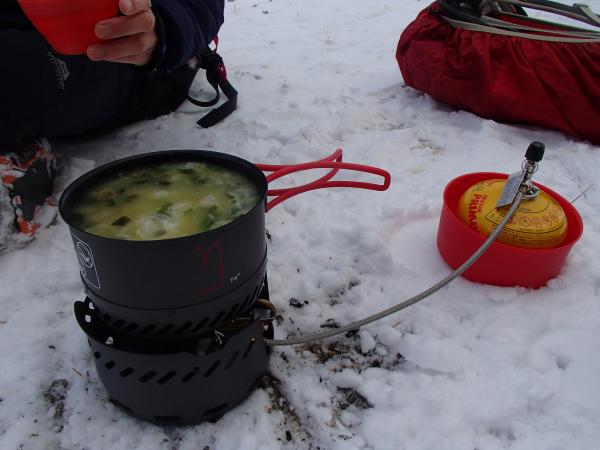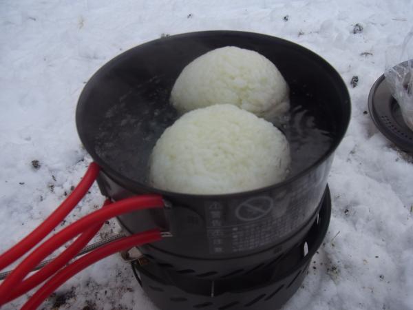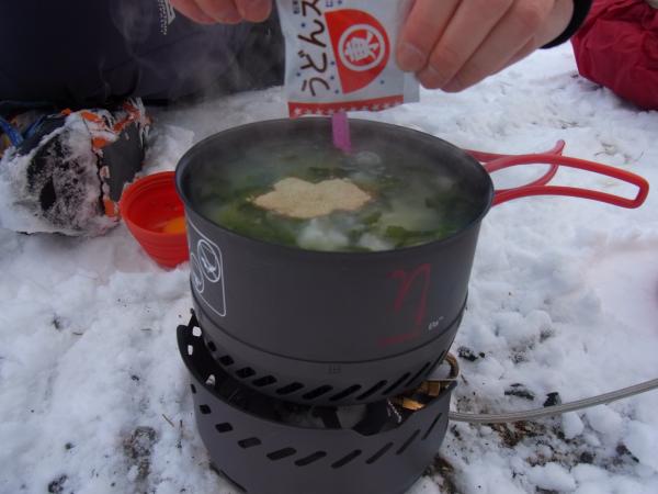 一軒茶屋で、雪の上で野沢菜ぞうすいをつくりましたが、
