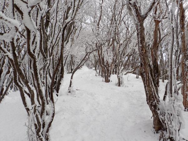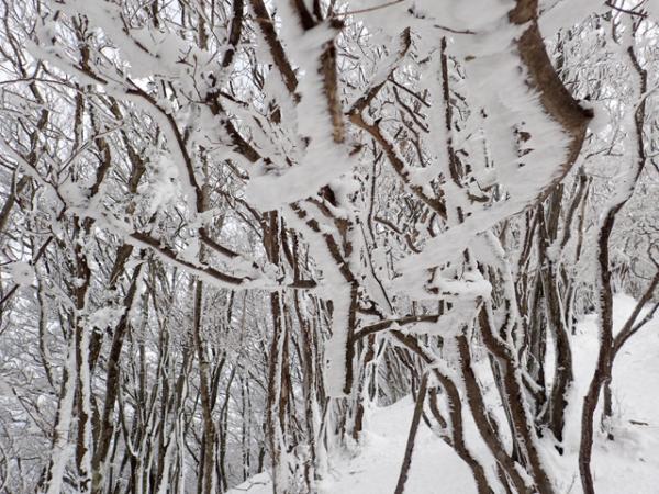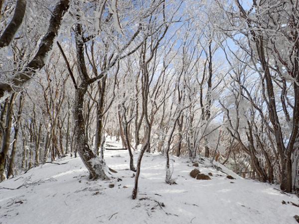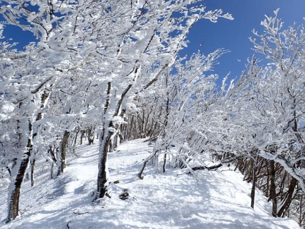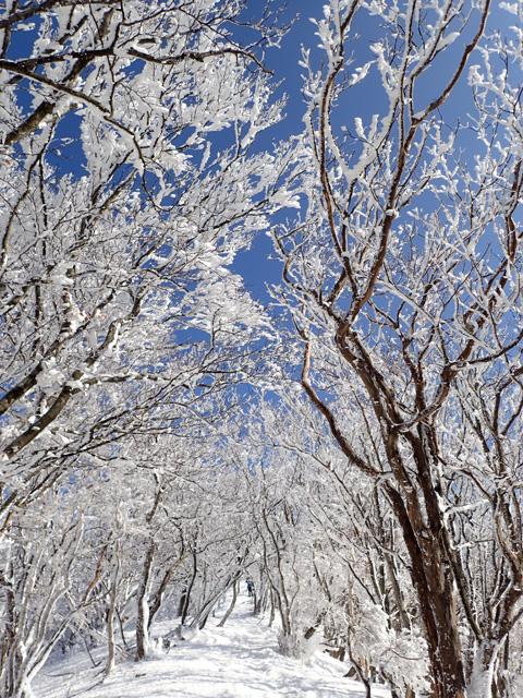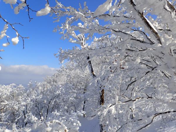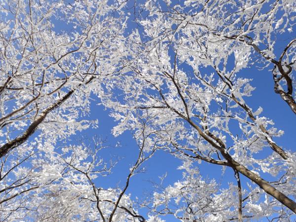 しかも距離もなかなかあります。ですがまさにその急坂から奇麗な霧氷が始まるので、上を見ながらゆっくり歩くと疲れも気にならなくなると思います。