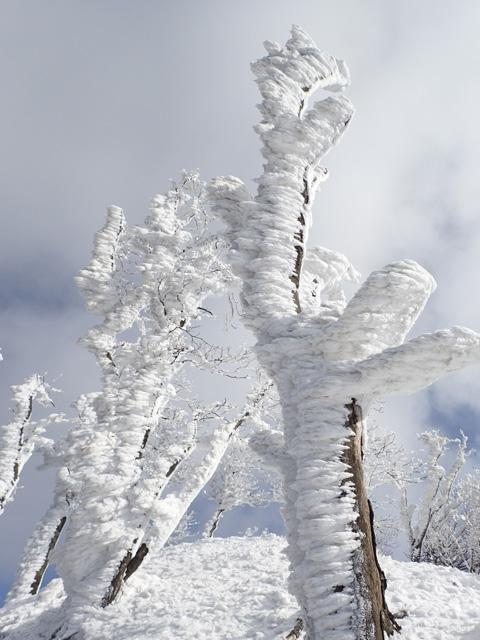 駐車場はあまり雪がなかったので大丈夫かなって思っていましたが、山頂は見事な霧氷の世界が広がっていました。